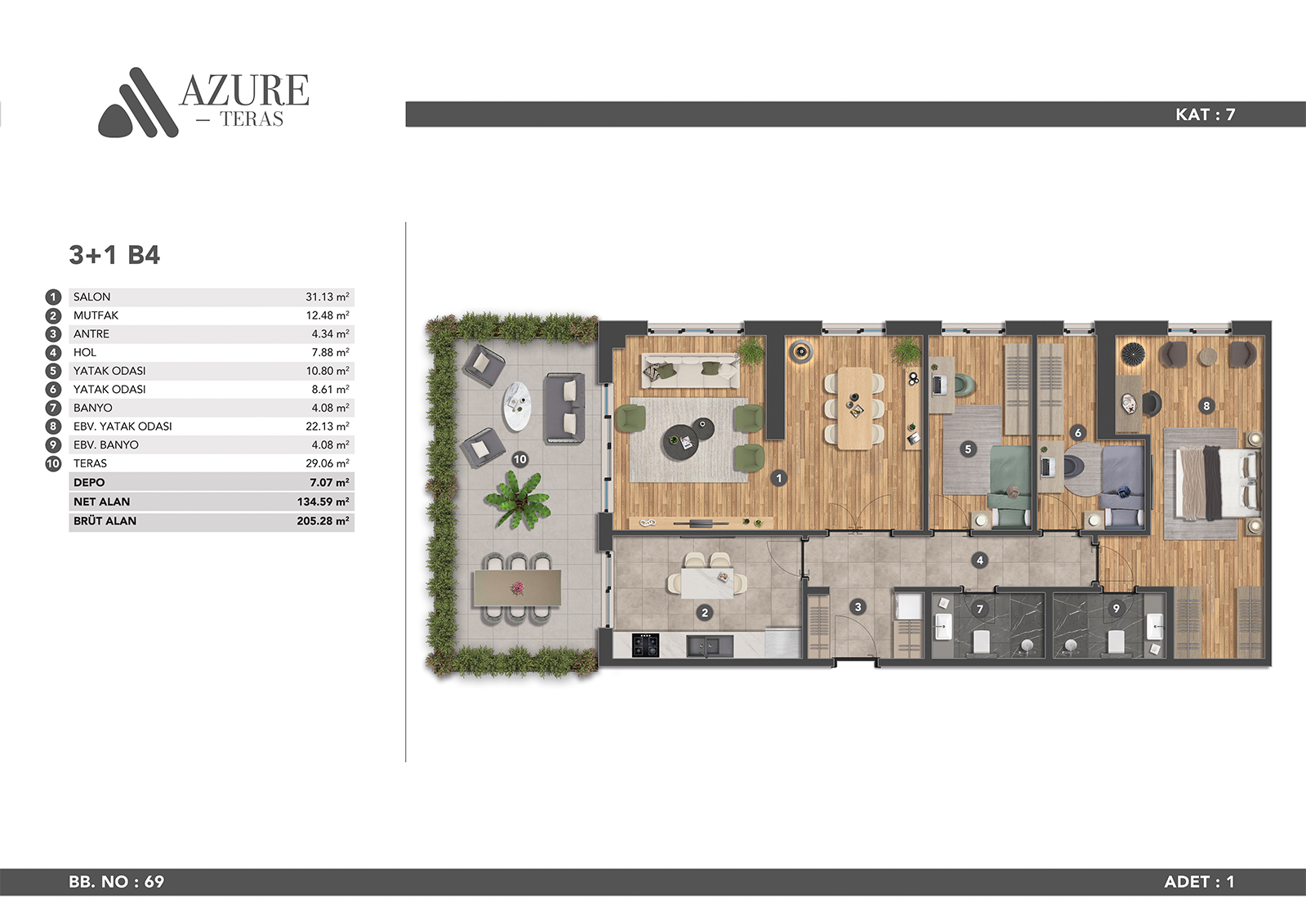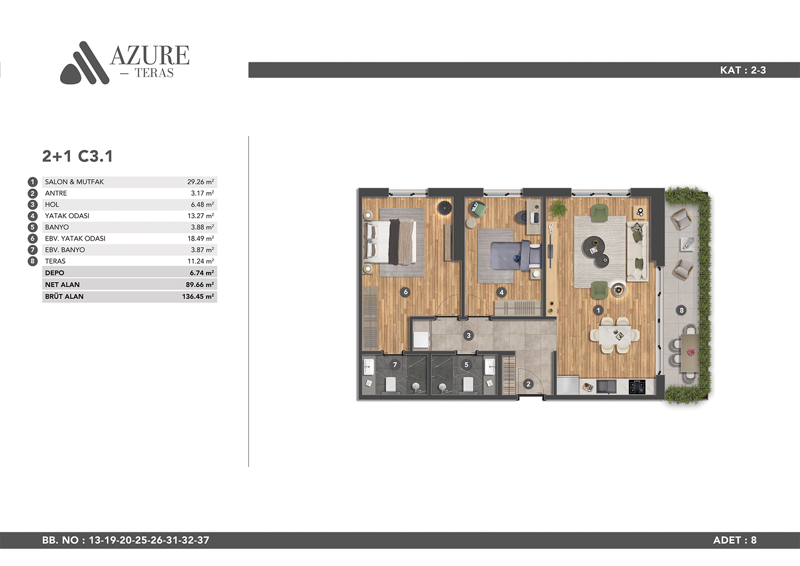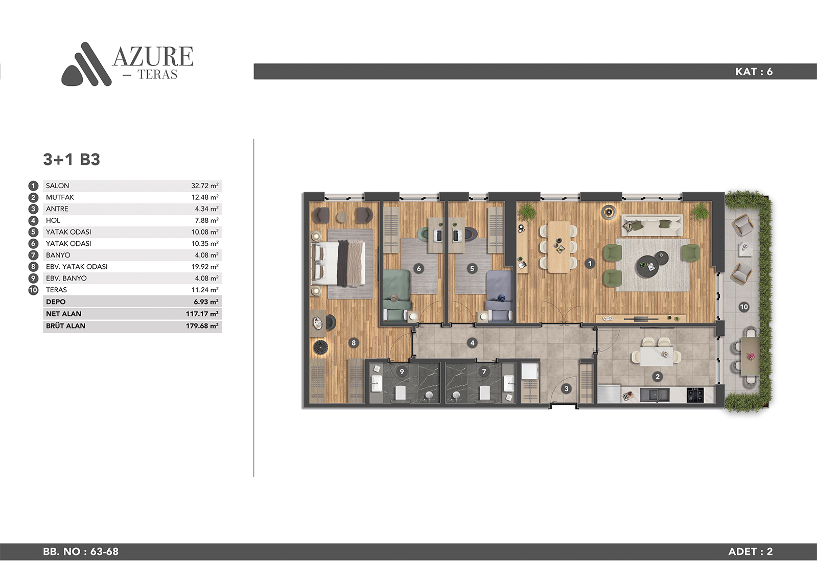 Azure Teras is designed to make you feel comfortable in modern city life with its large living spaces. A life away from the stress of the city awaits you in our apartments, which offer spaciousness and comfort in all areas.